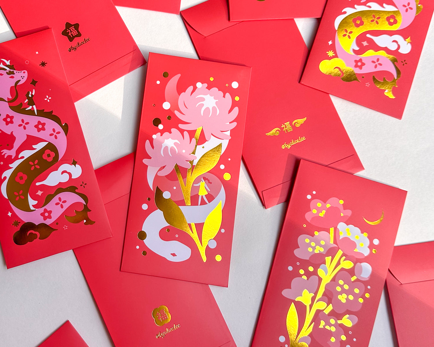2025 is the year of the snake — a symbol of rebirth, shedding old skin. For this year's red envelopes, I wanted to illustrate this very idea of moving into a new chapter, a new page, a new year — and flourishing. To have the courage and faith to start anew. To a brilliant 2025 in bloom.