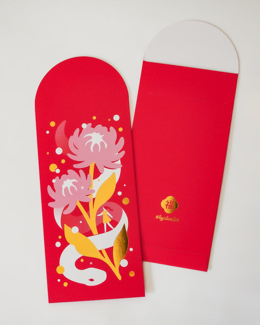 2025 is the year of the snake — a symbol of rebirth, shedding old skin. For this year's red envelopes, I wanted to illustrate this very idea of moving into a new chapter, a new page, a new year — and flourishing. To have the courage and faith to start anew. To a brilliant 2025 in bloom.