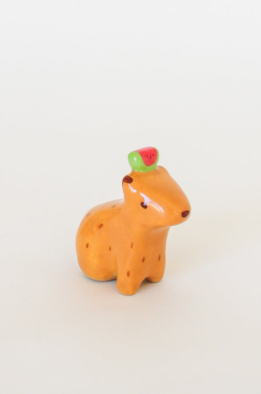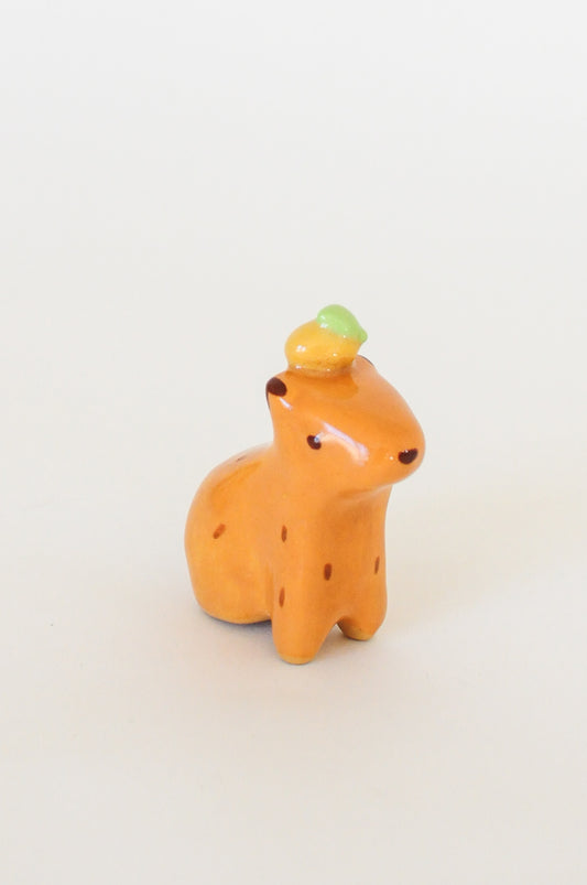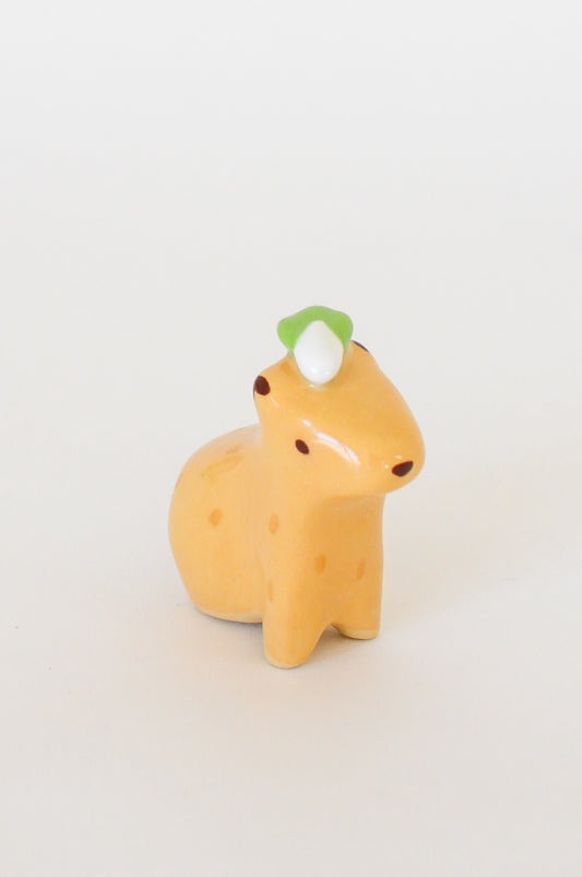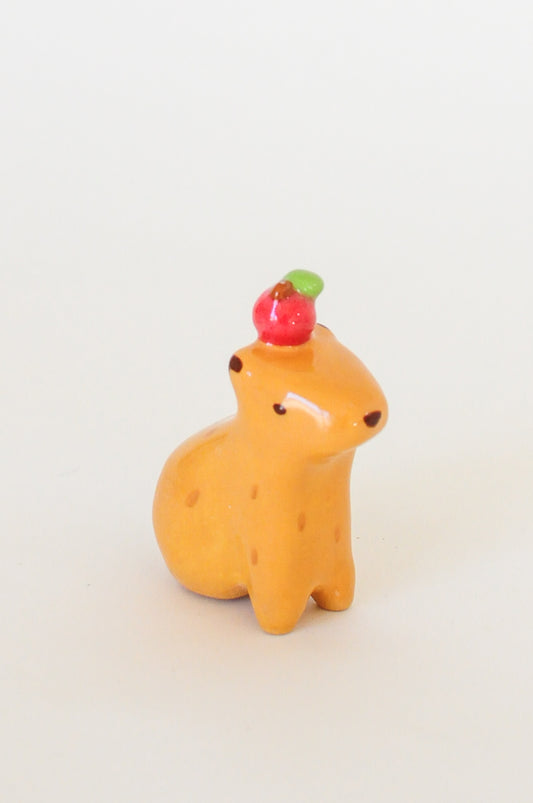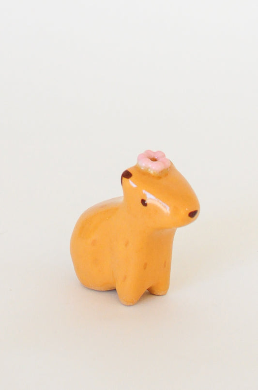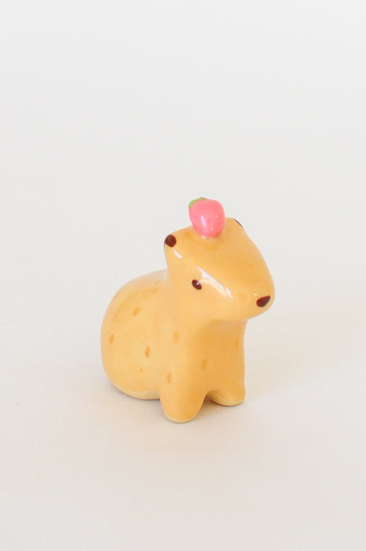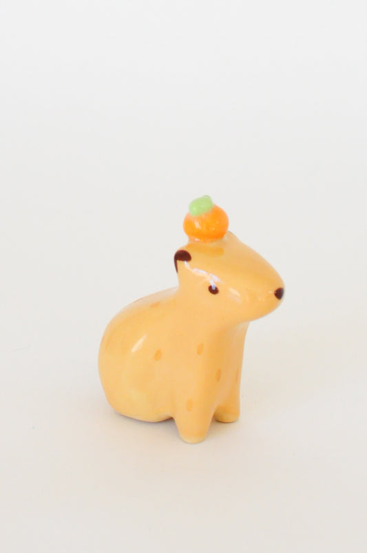 Capybara capybara capybara. With tan fur and a sleepy sort of expression (very cute though), sweet capy is ready for a wholesome life of bathing in the yuzu hot springs, carrying around a plant on its head, and napping.