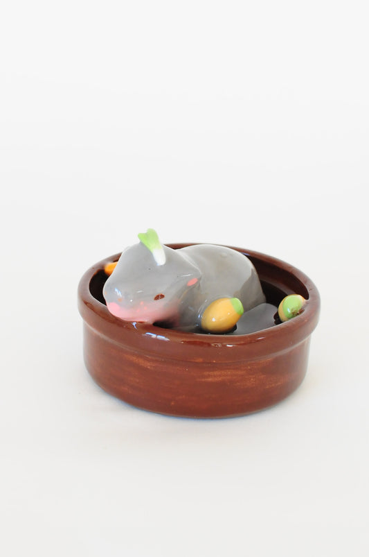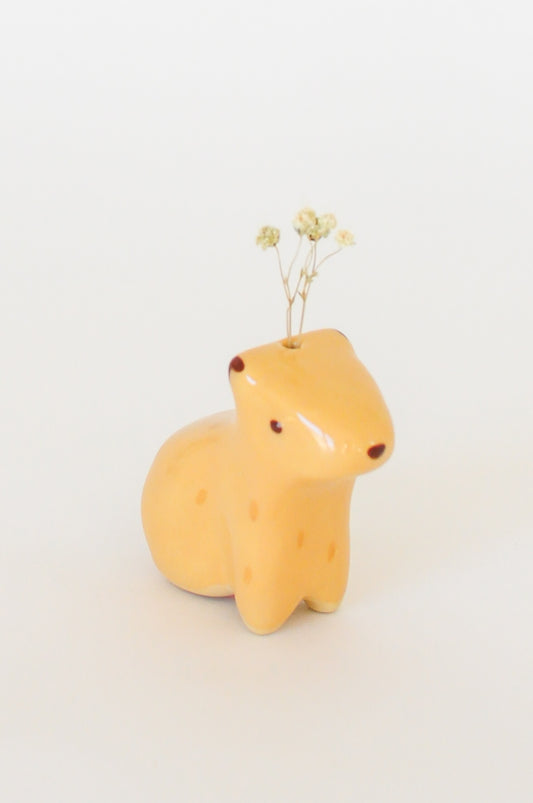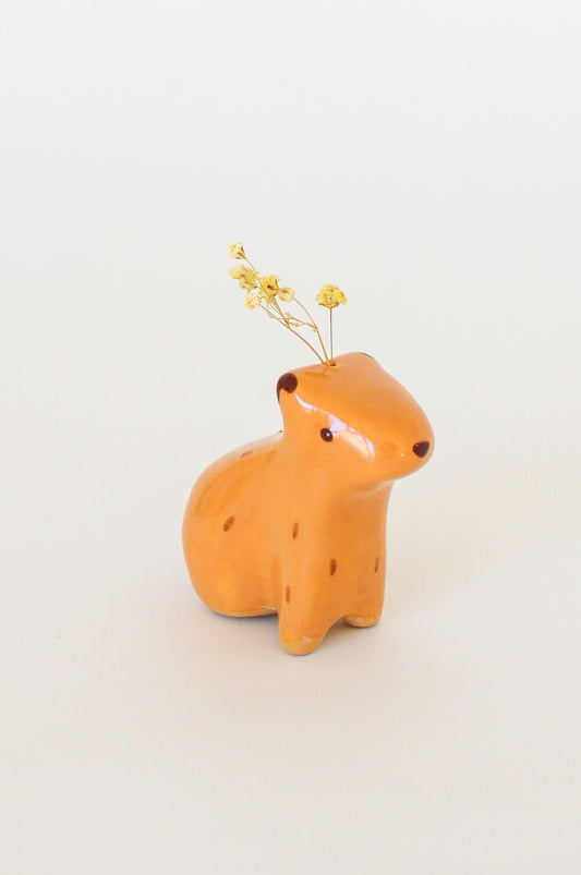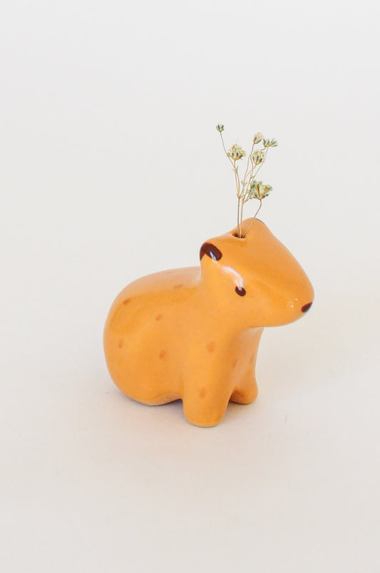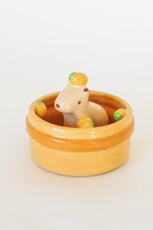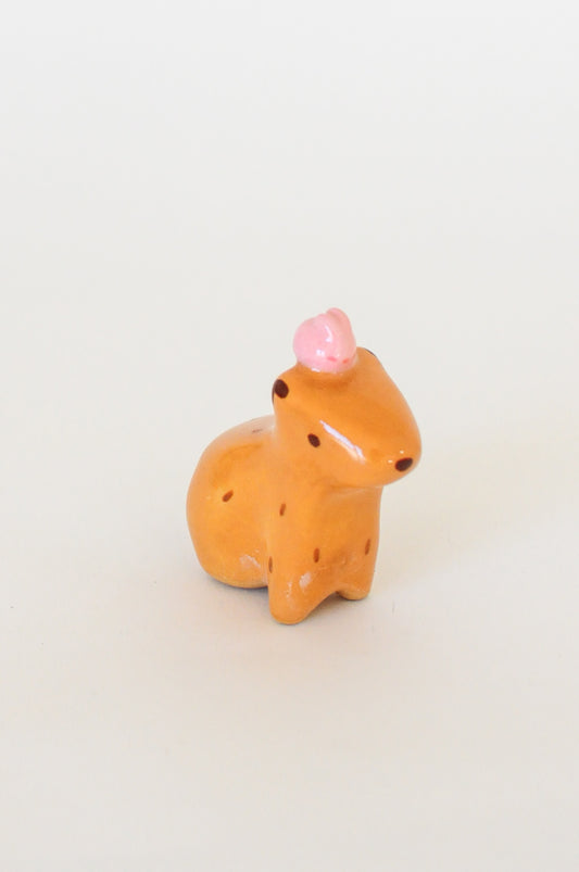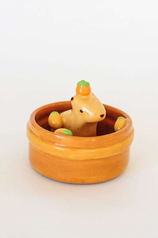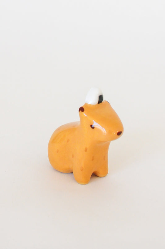 Capybara capybara capybara. With tan fur and a sleepy sort of expression (very cute though), sweet capy is ready for a wholesome life of bathing in the yuzu hot springs, carrying around a plant on its head, and napping.
