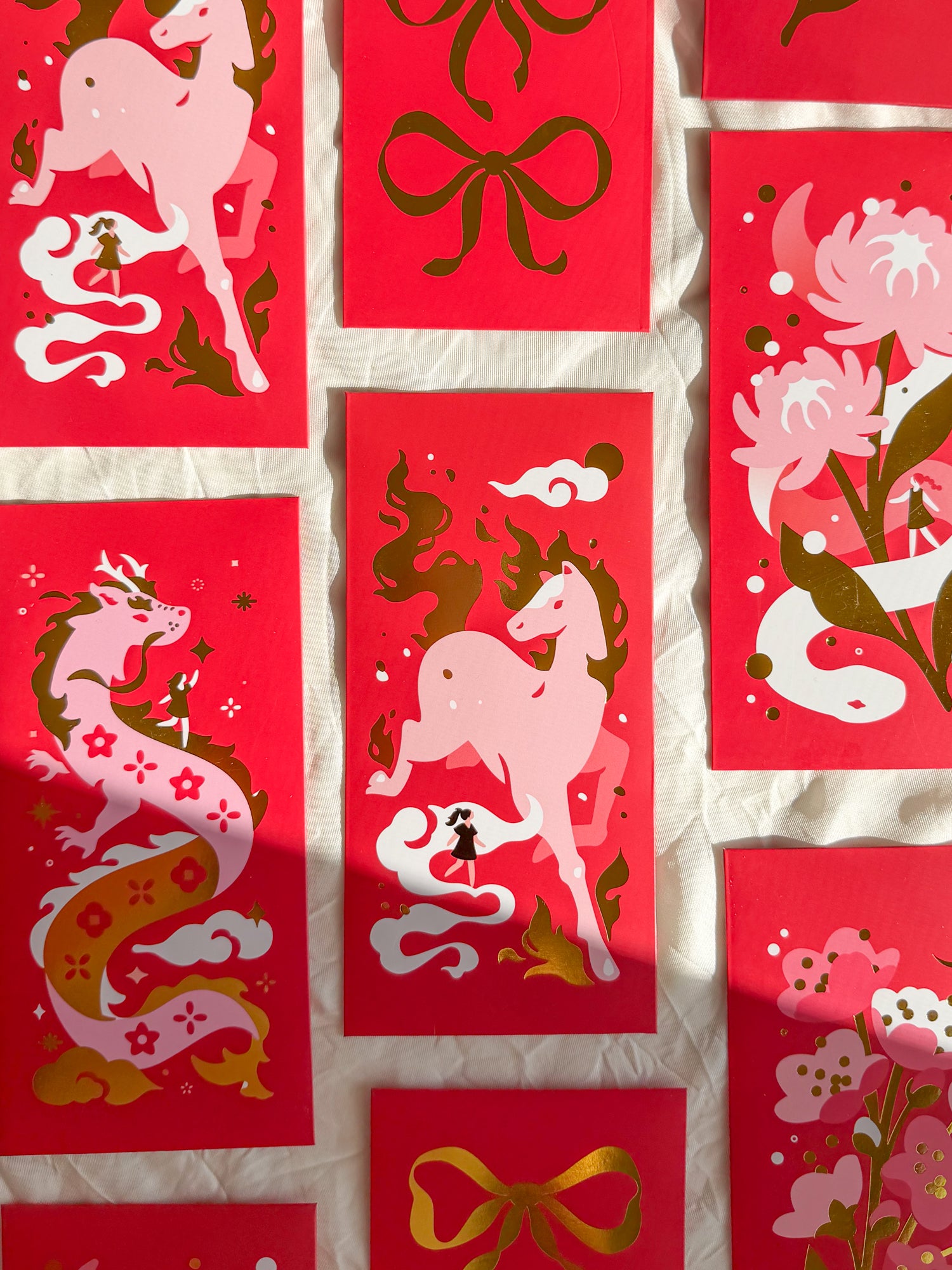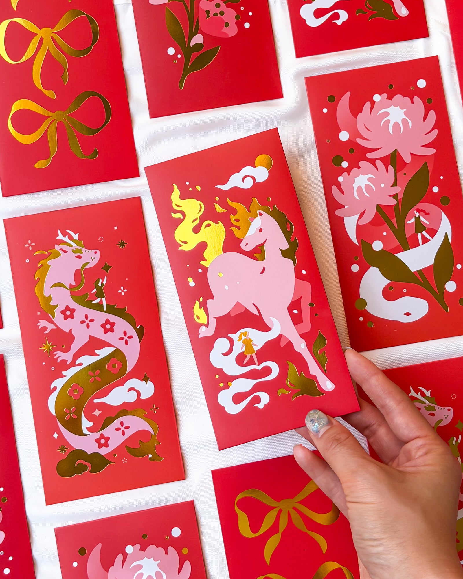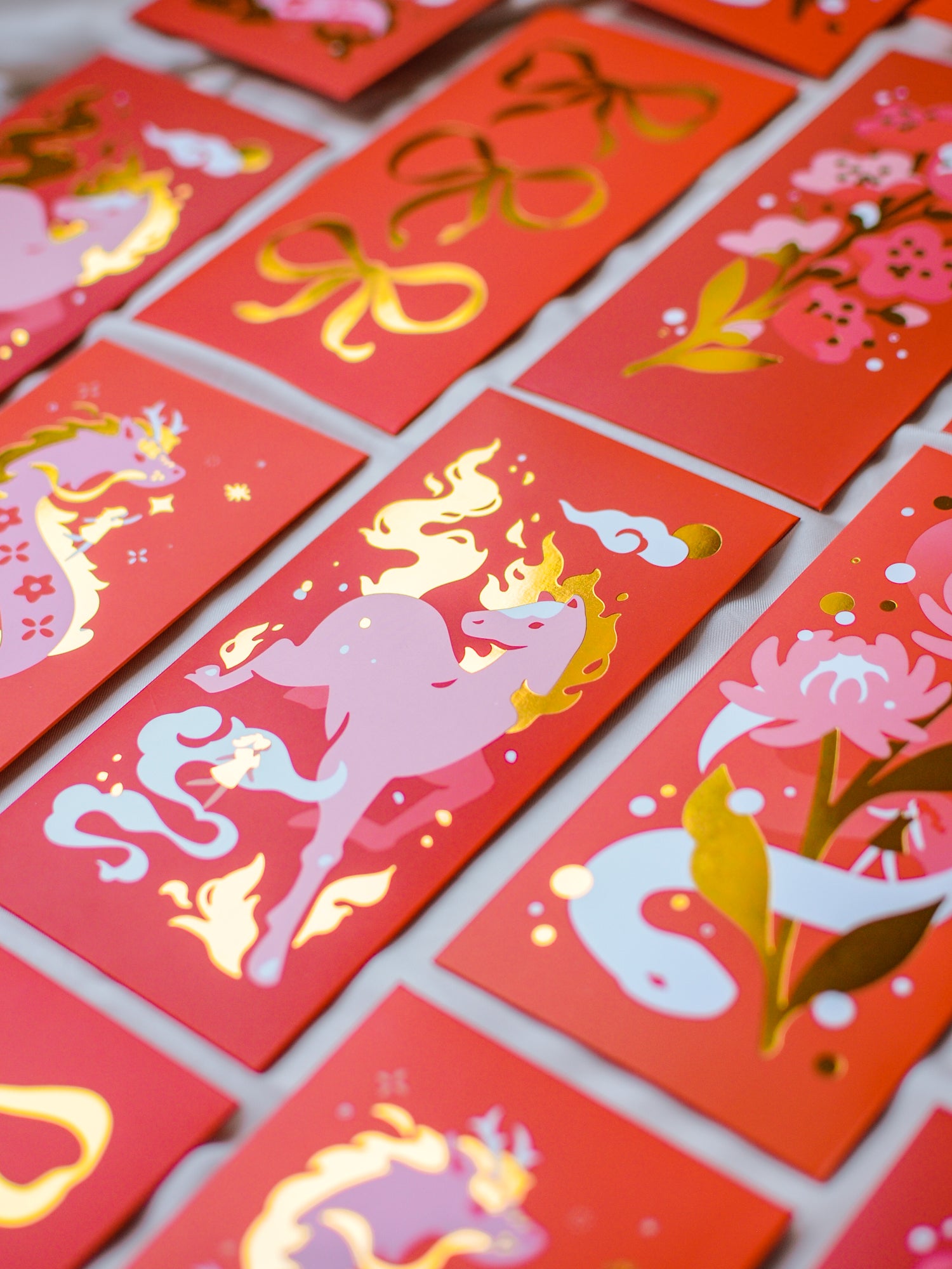 This bundle features all four red envelope designs that I have — the Year of the Horse, Snake, Dragon, Moonlit Peonies, and Coquette Bows.